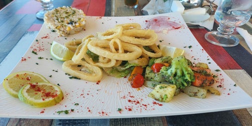 Ein Fischteller, sieht zwar gut aus, aber Rainer war nicht überzeugt. Ich hab die Kalamaris vom Teller gegessen. Kalamaris gab es nur beim Fischteller.