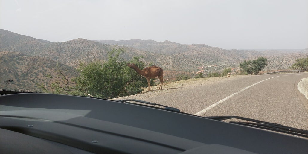 Am nächsten Tag nehmen wir es mit einer neuen Bergtour auf. Wir fahren durch den Zentralatlas-Tamazight. Leider habe ich keine Höhenangaben. Wir kommen aus dem Staunen nicht mehr raus. Eine wunderschöne Landschaft. Teilweise fahren wir im Konvoi mit anderen Wohnmobilen, was wir lustig finden. Endlich sehen wir auch mal freie Dromedare und was noch viel schöner ist am Ende treffen wir auf die berühmten Ziegen im Baum. Beim Filmen führt eine Ziege Regie und klettert auf den Baum.