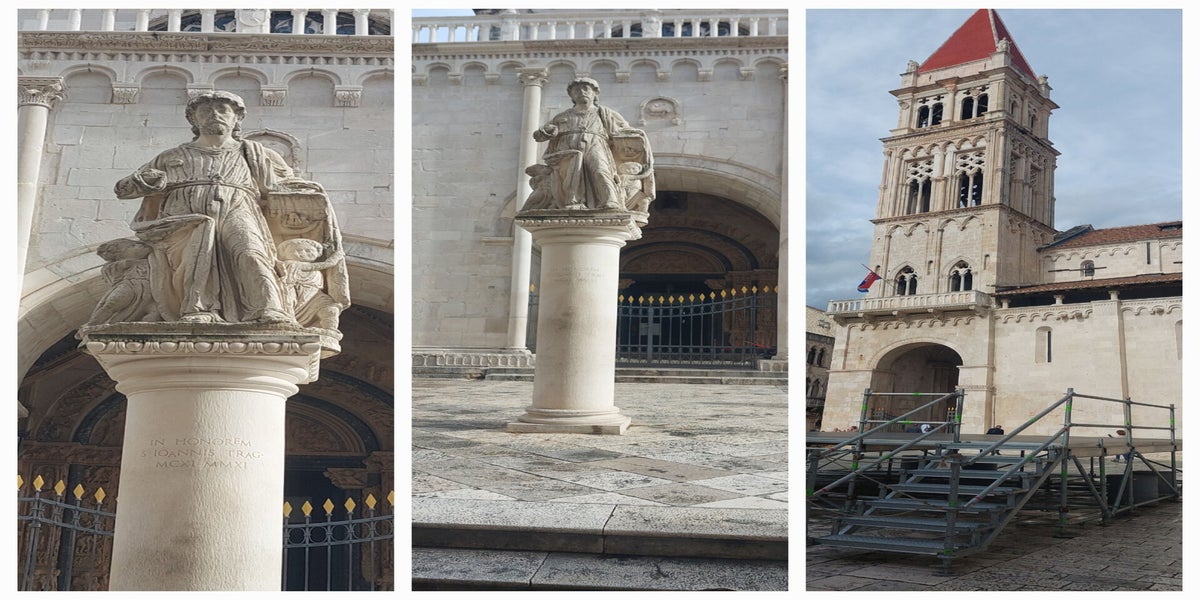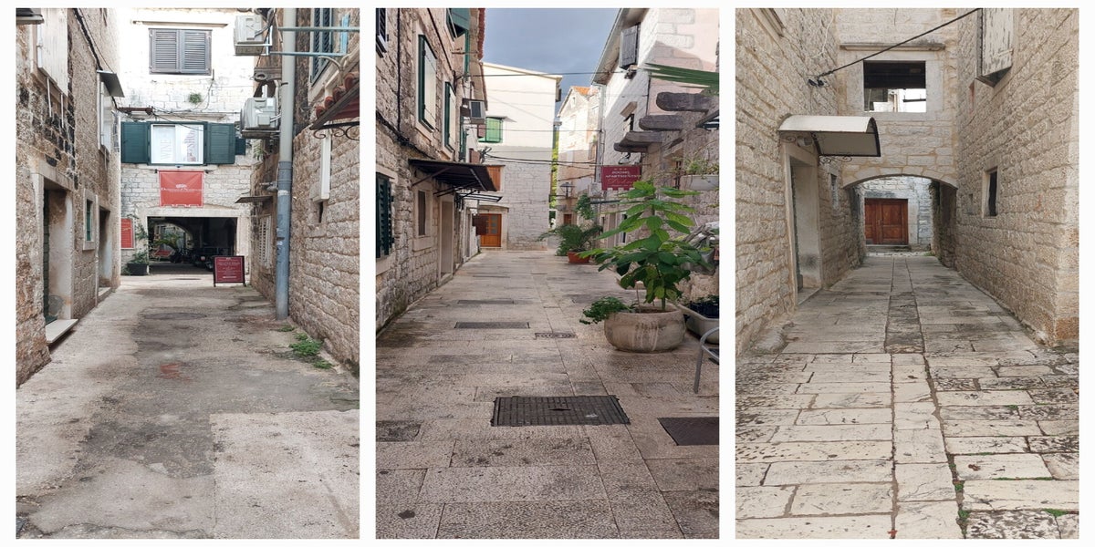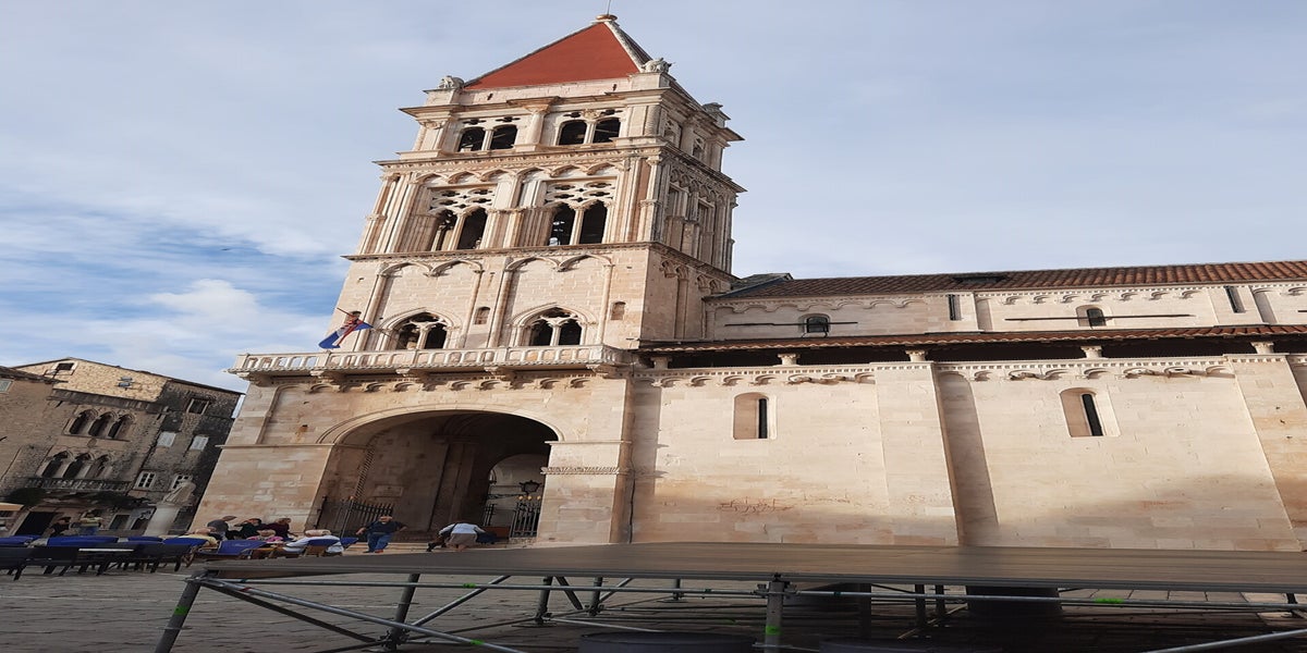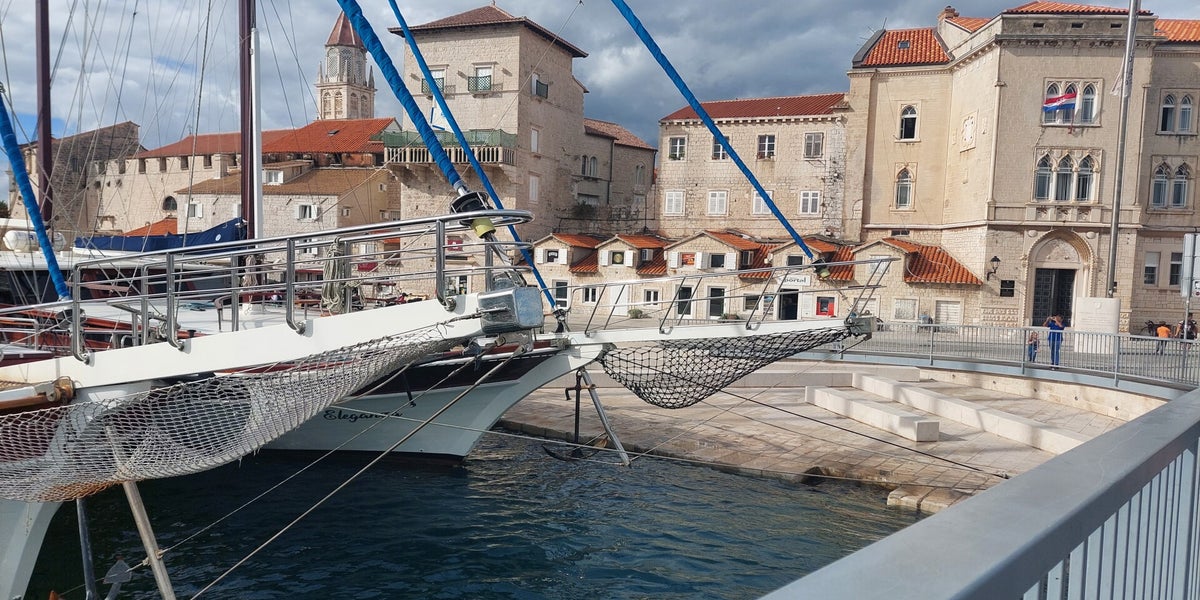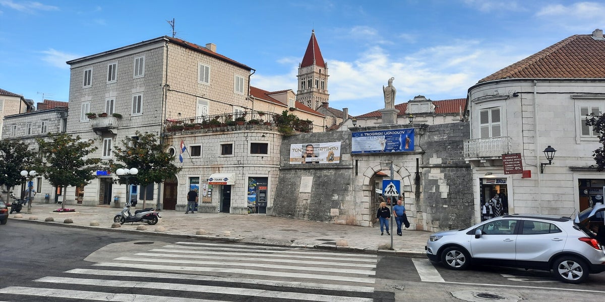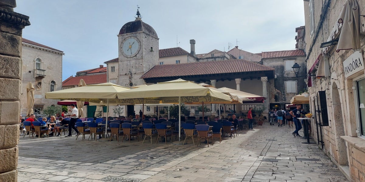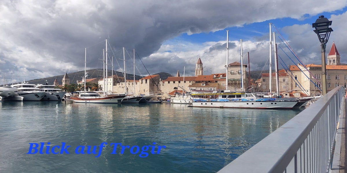 2 Tage Starigrad und den 2. Tag mit viel Regen reichen uns. So ziehen wir weiter Richtung Süden. Kurz vor Split, ändern wir unsere Route und fahren stattdessen nach Trogir. Wie es bei uns so üblich ist, starten wir auch gleich nach einem Einlaufkaffee und dem Starkregen, in den Ort. Ein nettes Restaurant treffen wir aber gegenüber von der Altstadt, das Odma Tu. Im Anschluß schlendern wir durch die Altstadt, Rainer möchte gerne auf den Turm, doch die 5 Euro sind ihm nicht angemessen, ebenso kostet es 5 Euro Eintritt in die Kirche.