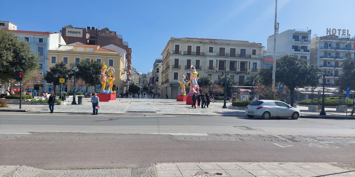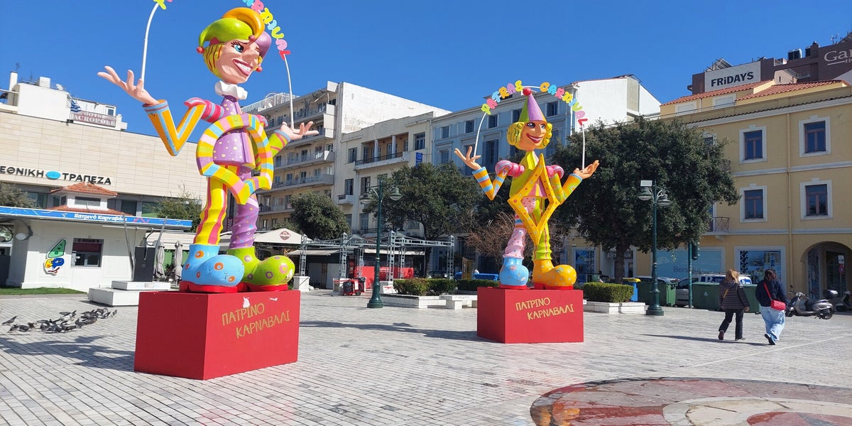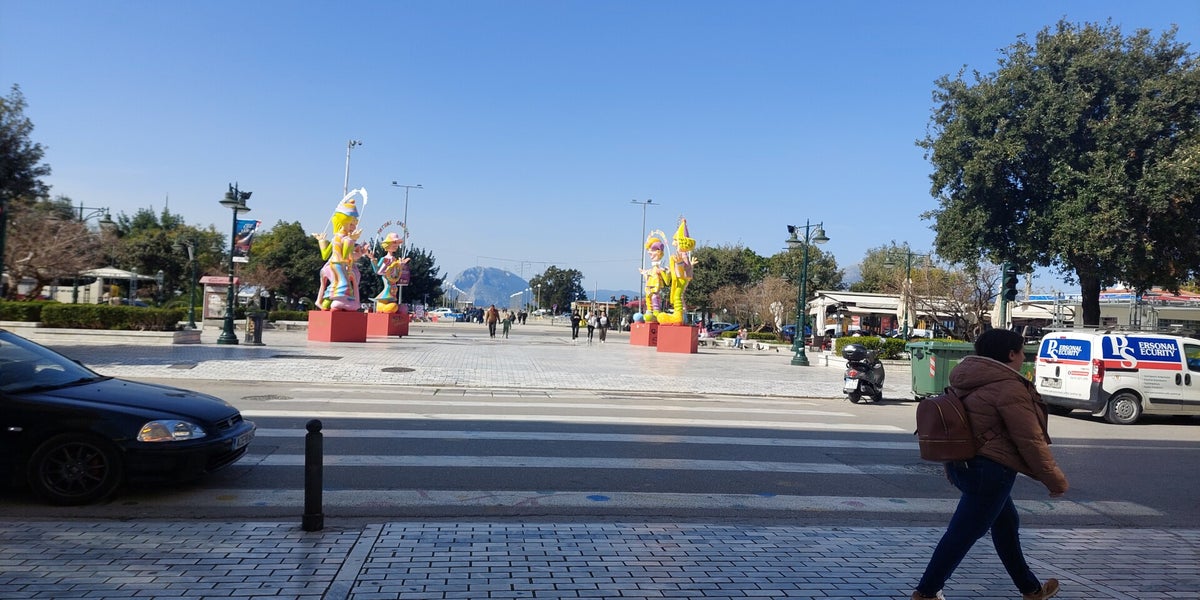Es ist eher eine Stellmöglichkeit mit Steckdose, die wir am Montag antreffen. Aber alles gut, wir dürfen bleiben und Rainer kauft 3 alkoholfreie Biere die sich als Wasser mit Grapefruit Geschmack herausstellen. Wichtig ist das alle zufrieden sind. Der Roller wird ausgepackt und wir fahren nach Patras rein. Dort finden wir Karneval-Gestalten. Hier ist am 18.März Rosenmontag, der in Patras groß gefeiert wird. Die Stufen in die Oberstadt haben wir nicht erklommen, ebenso haben wir die Burg nicht besucht.