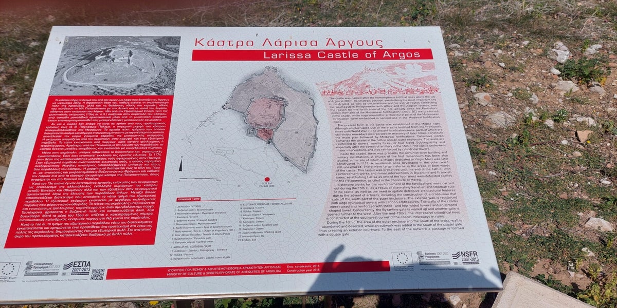 Wir machen einen Rundgang durch den Ortskern, der nicht sehr groß ist und finden ein nettes Lokal. Da es noch früh am Tag ist und wir noch keinen Hunger haben, entscheiden wir uns doch noch, auf die Burg Larissa zu fahren. Google schickt uns zuerst Serpentinen zur Griechisch-Orthodoxen Kirche Agios Georgios. Auf dem Rückweg stellen wir fest, dass wir eine Abkürzung, über einen mehr oder weniger Trampelpfad nehmen sollten. Ein paar Meter weite finden wir dann den korrekten Weg zur Burg hinauf. Wir kommen noch am Kloster Agia Marina Argos vorbei.