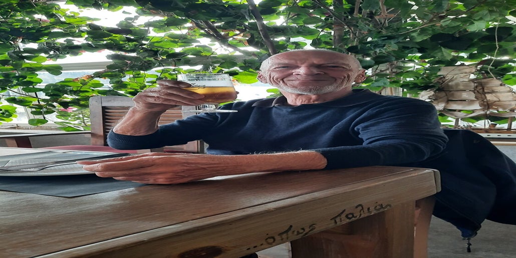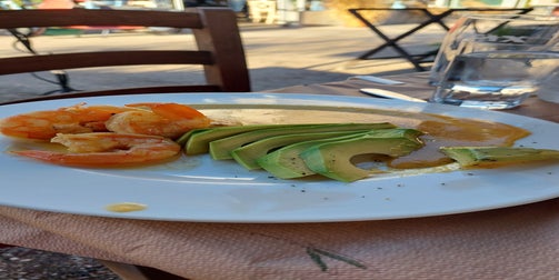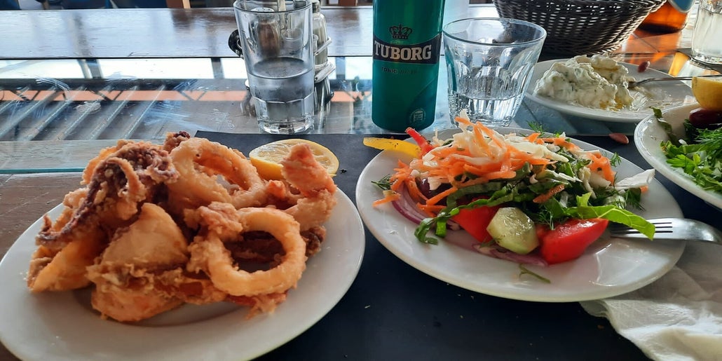Essen in Tolo am 09.12.2023. Das Restaurant liegt direkt am Meer und ist bei kühleren Tagen nicht wirklich gemütlich. Es gibt nur eine Plane zum Schutz. Rainer hatte eine frisch gekochte Fischsuppe und ich meine obligatoren Calamaris.