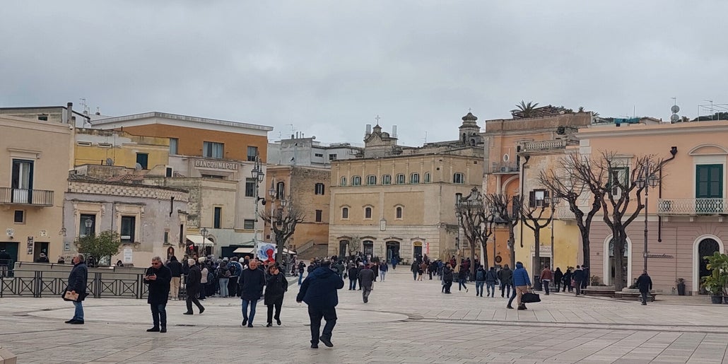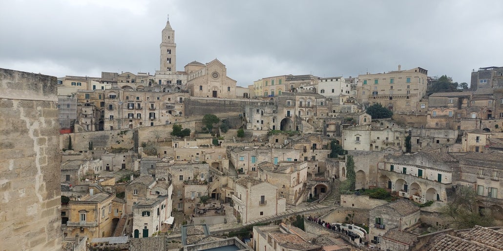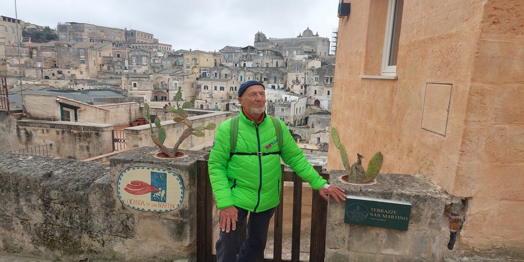 Nach dem Frühstück geht es nach Matera. Im Ort ist auch für Roller Fahrverbot, man kann sich von den kleinen blauen Bussen fahren lassen.