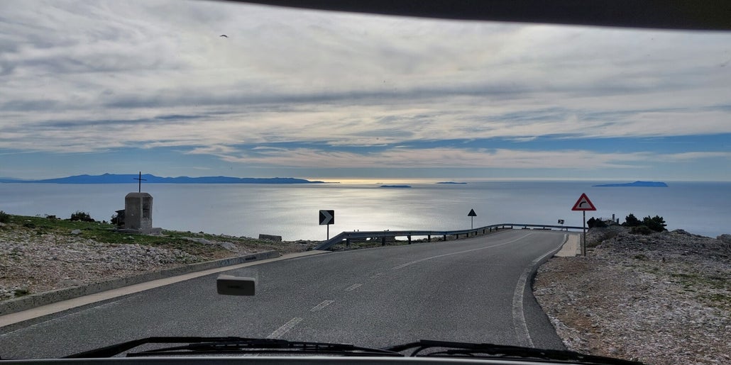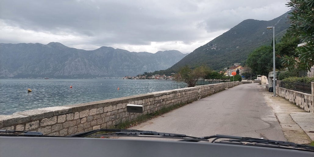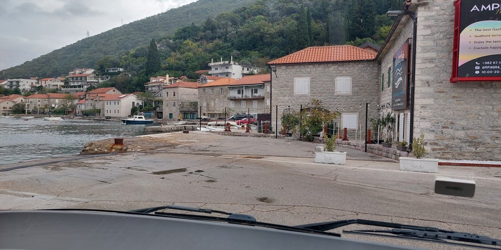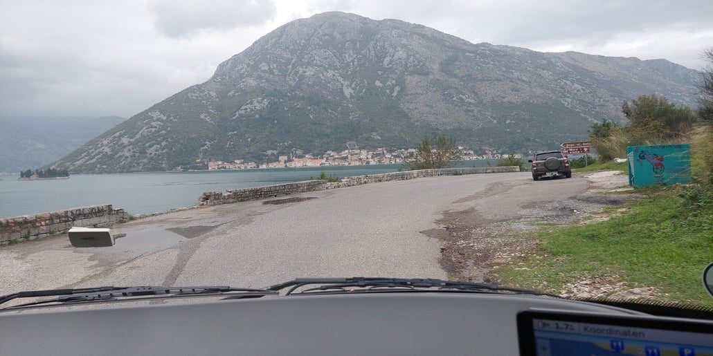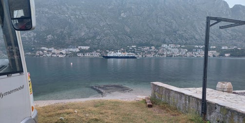 Am 07.11. fahren wir dann tatsächlich weiter. Kotor in Montenegro ist das Ziel. Ich habe einen Campingplatz rausgesucht, nicht weit von Kotor entfernt. Die Fahrt dorthin ist sehr angenehm über Landstraßen. Unser Navi führt uns zu einer Fähre, die uns für 10,50 Euro auf die andere Seite bringt. Doch o weh, die Straße die wir lt. Navi nehmen sollen ist sehr schmal. Mein erster Gedanke ist zurück, das sind nur wenige Meter. Doch Rainer entscheidet sich für geradeaus. Es gibt zwischendurch Stellen wo der eine oder andere sich an die Seite quetschen kann. Und dann endlich der Campingplatz, aufatmen, und eine Parkmöglichkeit. Rainer steigt aus und geht gucken. Mist, da ist keiner, alles abgeschlossen. Also weiter und das alles ohne Internet. Nach einigen Km kommt am Wasser eine Parkmöglichkeit, da fährt er rauf und Schluss.