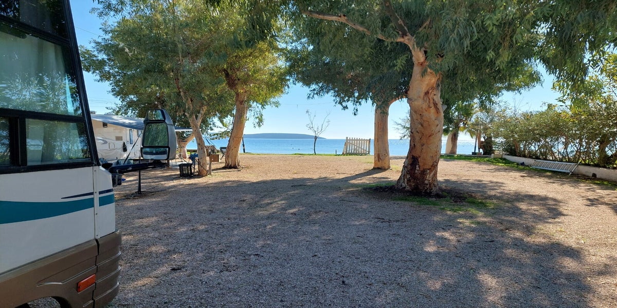 Und wir sind etwas blauäugig und außerdem viel zu schnell hier angekommen, zum Endziel ist nun nicht mehr weit, doch unser Stellplatz mit der weißen Pforte ist noch belegt. Rainer hat mit Adrian über WhatsApp kommuniziert. Der schrieb, es gibt eine gute Saison, euer Platz ist noch belegt. Mist, der 1. Gedanke, der 2. wir bleiben dann halt noch etwas hier in Delphi. Am Sonntag kam ein Foto von Adrian und er meinte diesen Platz könne er uns anbieten, zwischen einigen Autos. Nein danke. Die nächste Nachricht: euer Platz ist bis zum 15.12. belegt. Womit wir überhaupt nicht einverstanden waren, was wir auch massiv beantwortet haben. Er hat dann aber auch unsere Reservierung gefunden und gefragt wann wir kommen wollen. Damit keiner großen Stress hat, haben wir den 15.11. genannt, was Adrian bestätigt hat. Delphi ist auch schön.